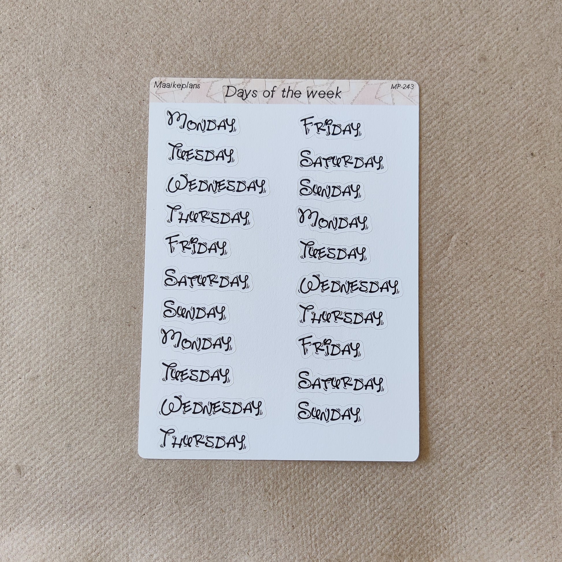 This sticker sheet contains stickers with the days of the week. Perfect for creating your own planner or journal.