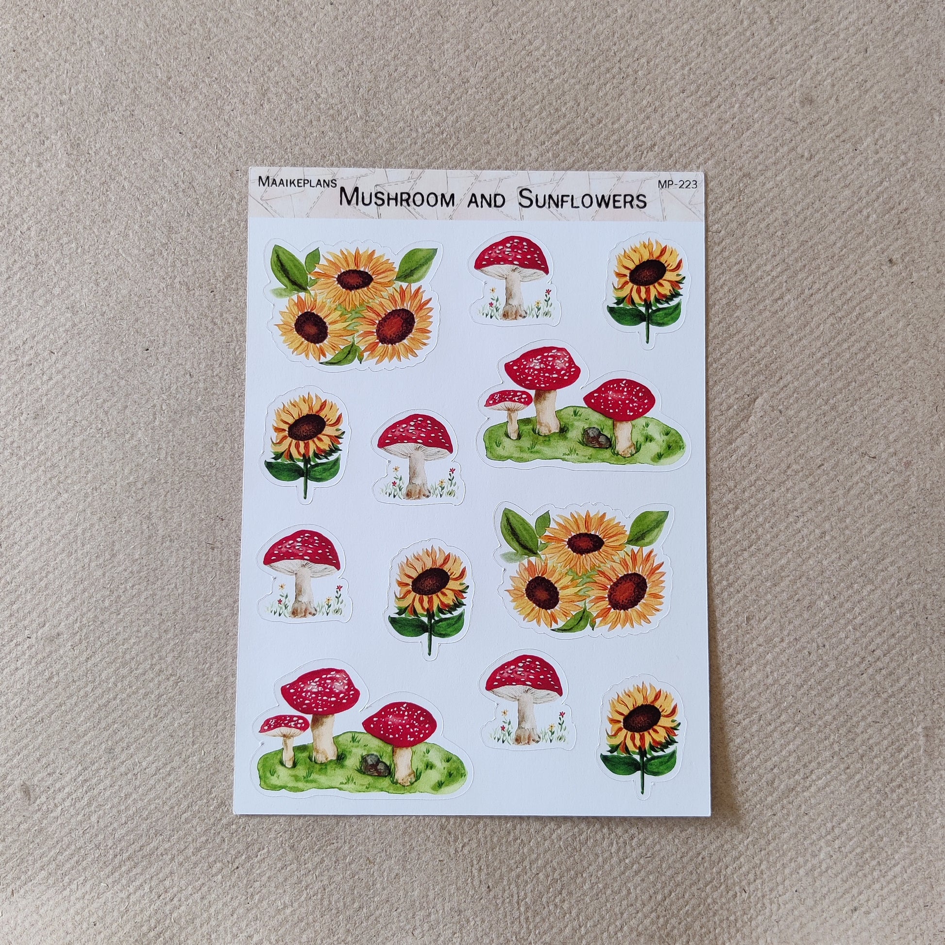 This sticker sheet features beautiful watercolor mushrooms and sunflowers.