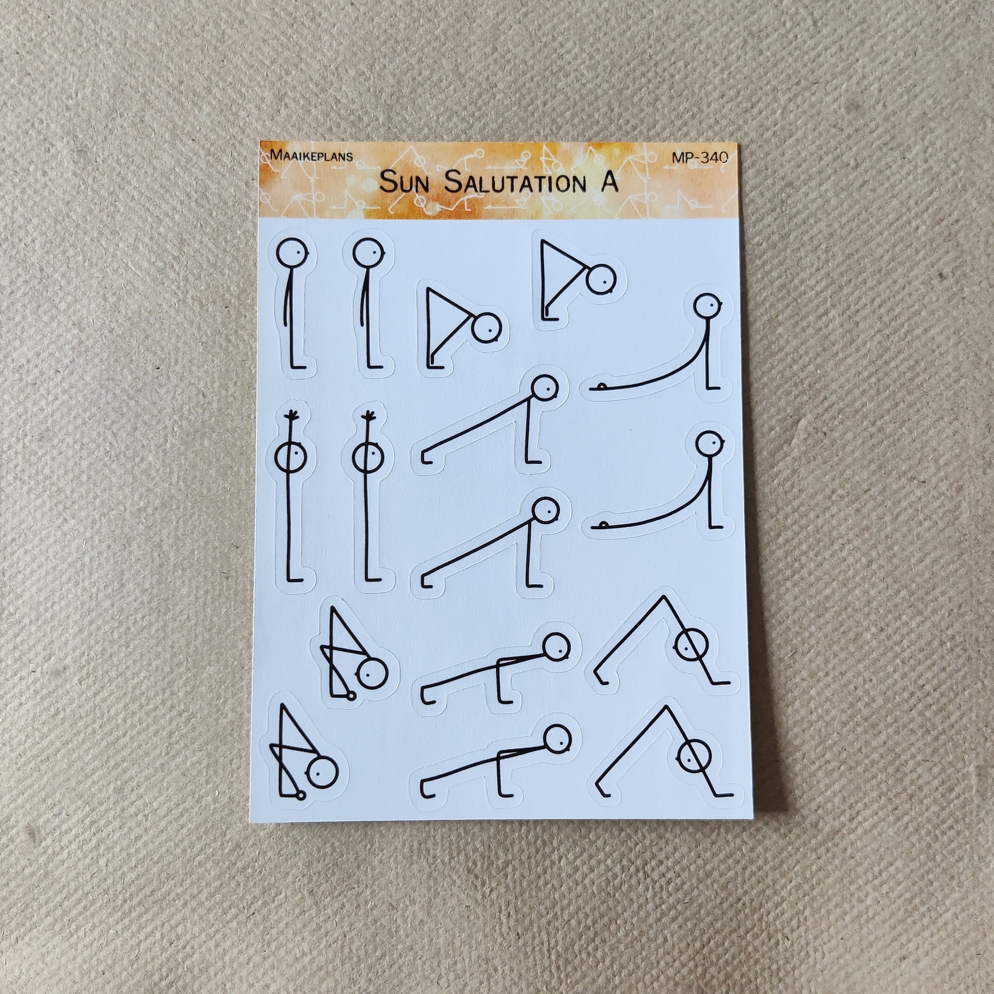 This sticker sheet contains stickers of stick figures in yoga asanas. Together, they form the sun salutation A.