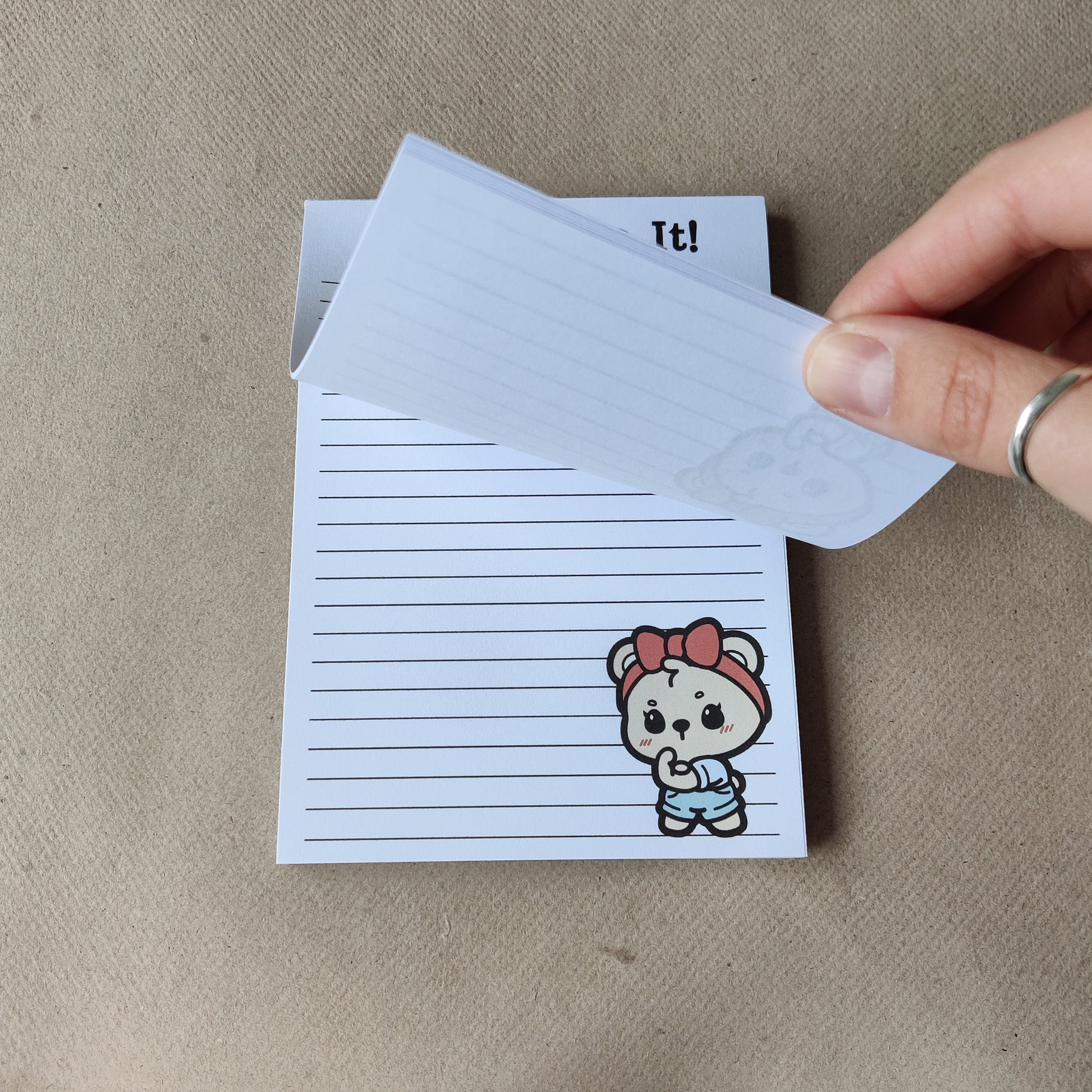 Het is een handgemaakt A6 notitieblok met 50 gelinieerde en afscheurbare vellen. De vellen zijn aan één kant bedrukt en de achterkant is van 2 mm dik stevig karton.
